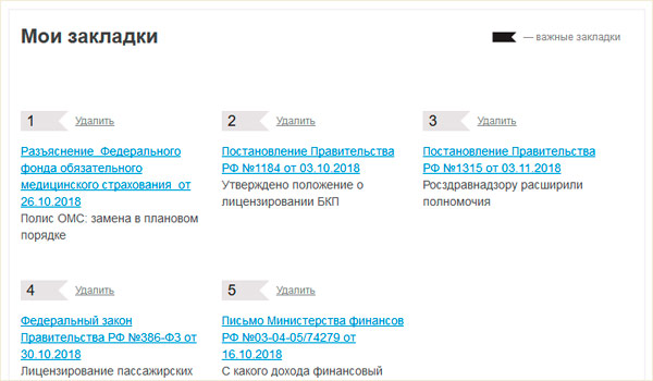На сайте есть функция «Мои закладки». Отмечайте важные для себя документы, чтобы находить их сразу. Все документы, которые Вам важны или вызывают вопросы, отметьте закладкой и храните в специальном разделе Вашего личного кабинета.