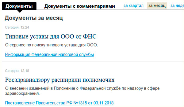Вы не пропустите документы, которые выйдут и вступят в силу во время Вашего отпуска и в случае, когда у Вас не было возможности ежедневно просматривать свежие материалы на сайте. Отбирайте документы с помощью фильтров: за неделю, за месяц или за квартал. Если нужно просмотреть документы за определенную дату, выбирайте нужный день в календаре и Вы увидите документы за этот день.